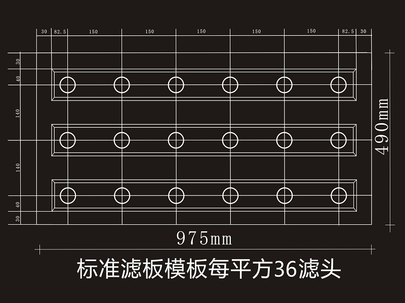 A型模板長×寬×高(975×490mm×55mm),厚度3.0mm,誤差0.2mm;可安裝濾頭數(shù)量18個(gè)/塊和21個(gè)/塊。相當(dāng)于36個(gè)濾頭/㎡(縱向間距150mm,橫向間距140mm),42個(gè)個(gè)濾頭/㎡(縱向間距130mm,橫向間距160mm)濾梁中心間距1000-1060mm。